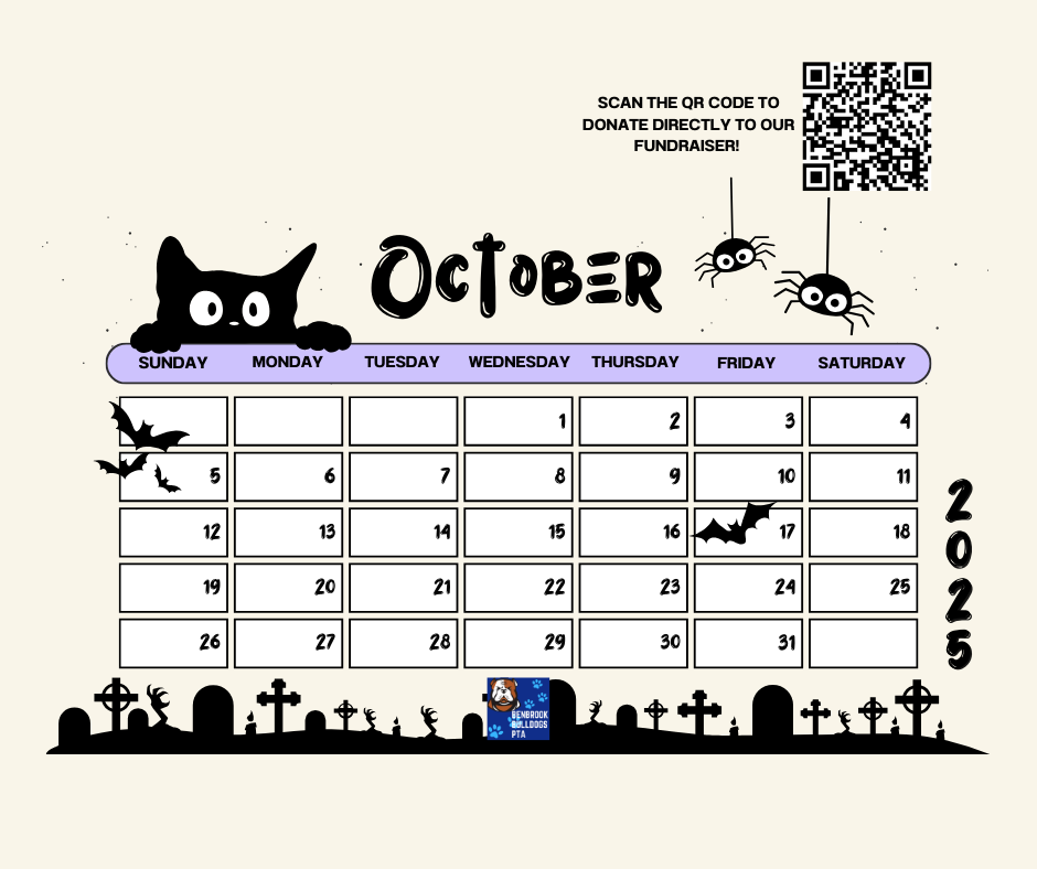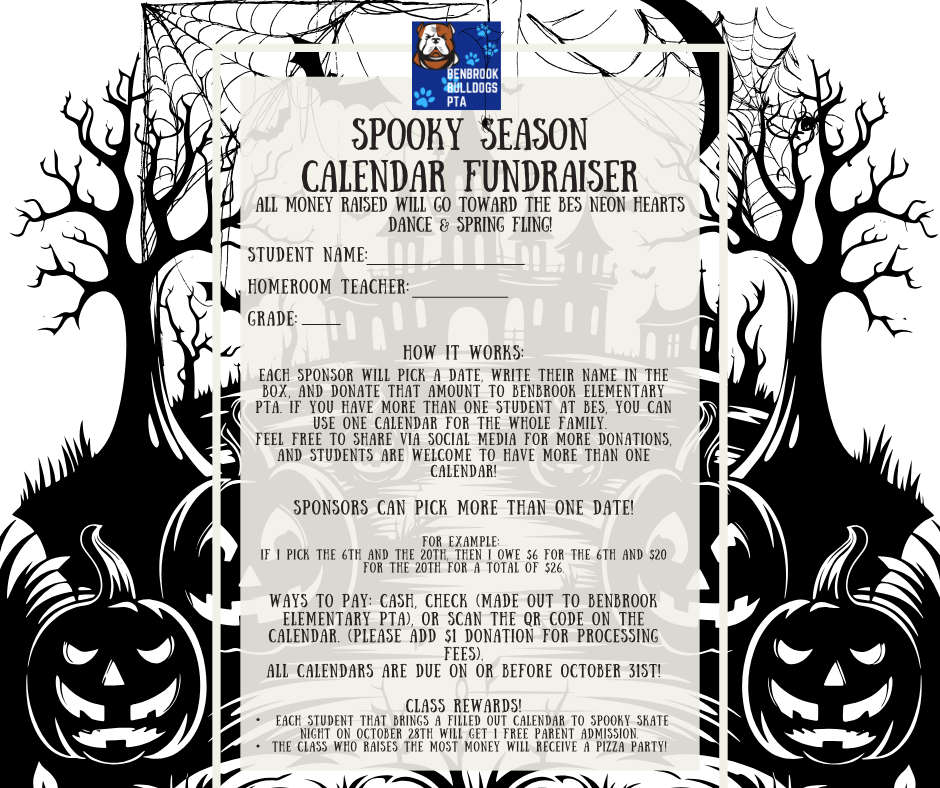 Ways to pay: Cash, Check (made out to Benbrook Elementary PTA), or scan the QR code on the calendar. (Please Add $1 donation for processing fees).