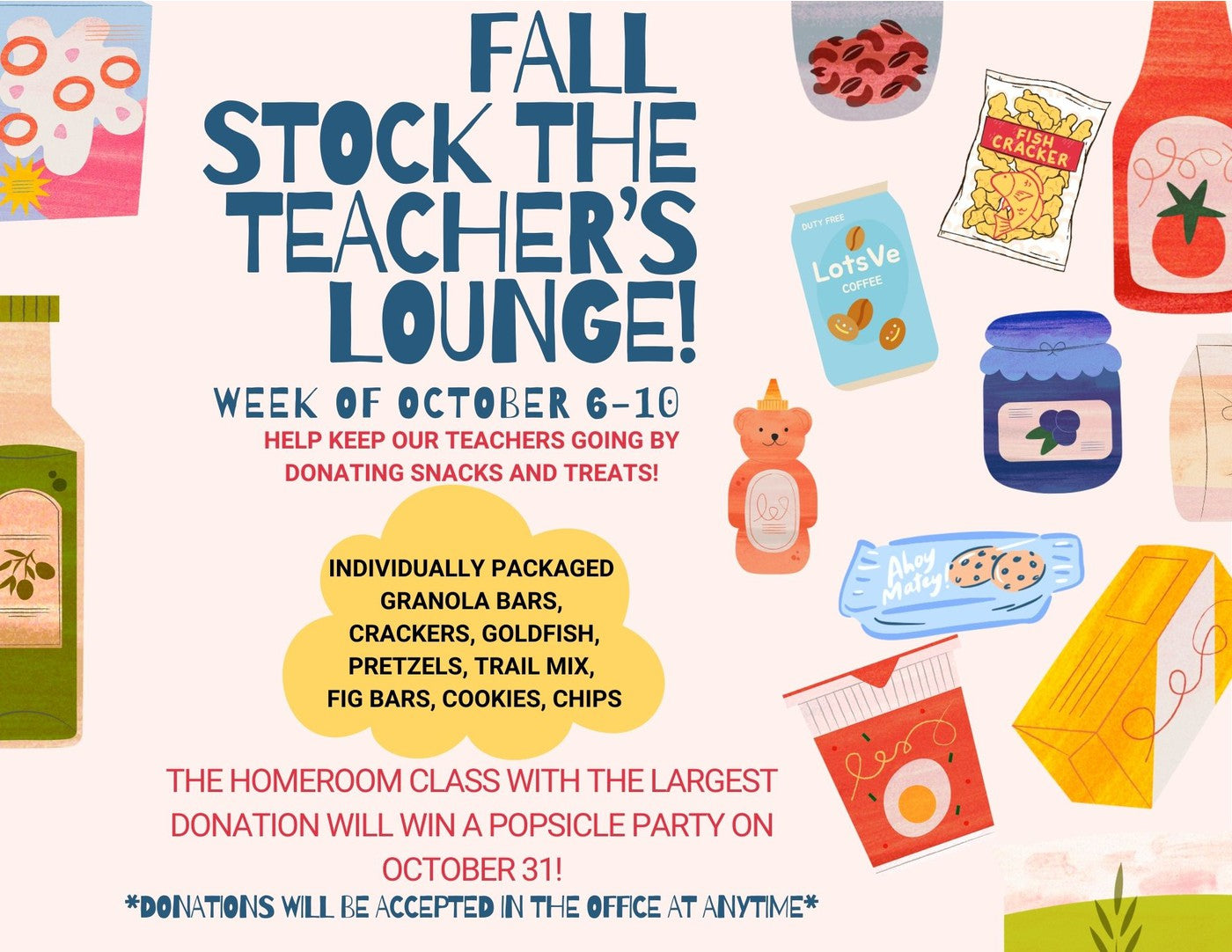 The School is hosting a stock the teacher's lounge drive from October 6-10th - The homeroom class with the largest donation will win a popsicle party on October 31st!